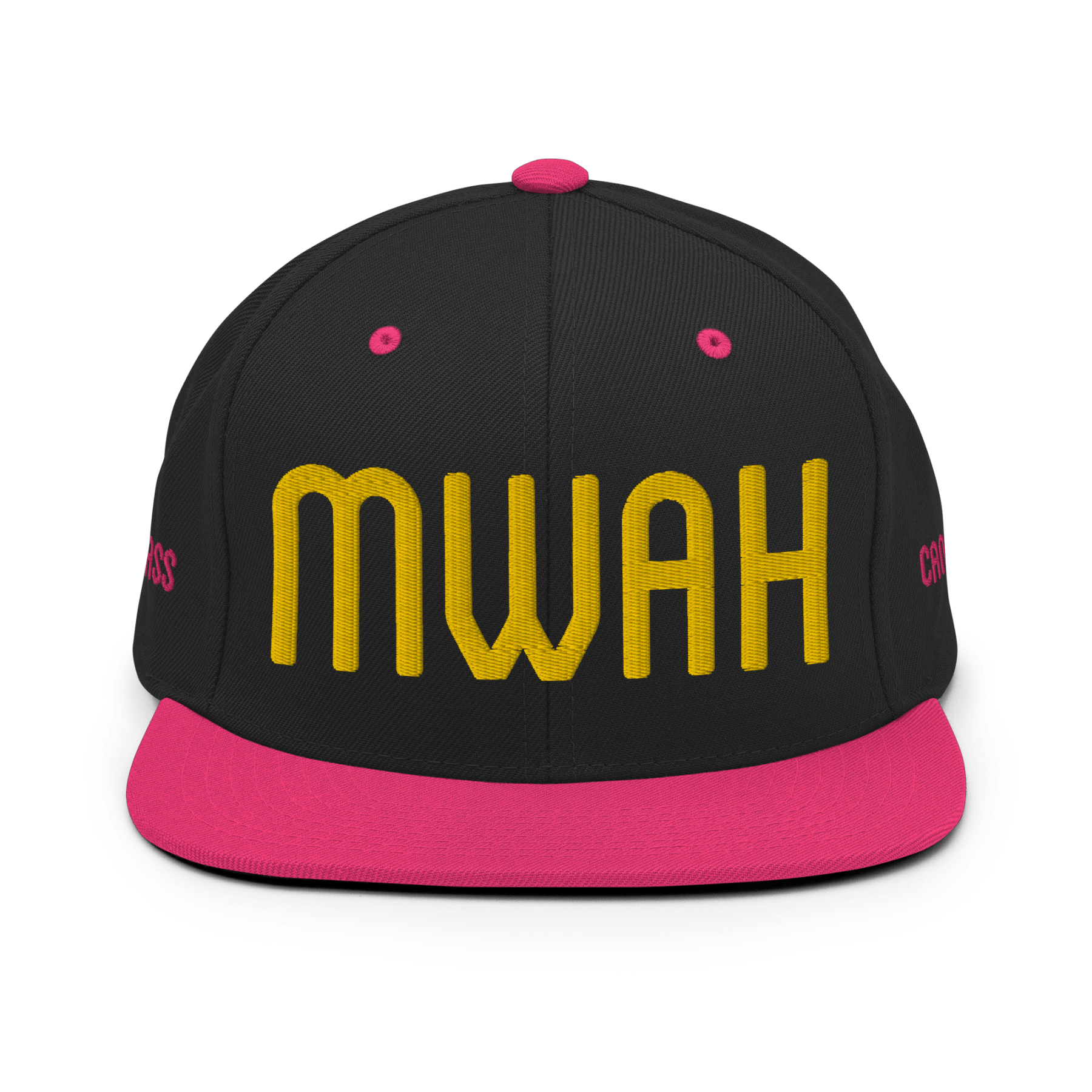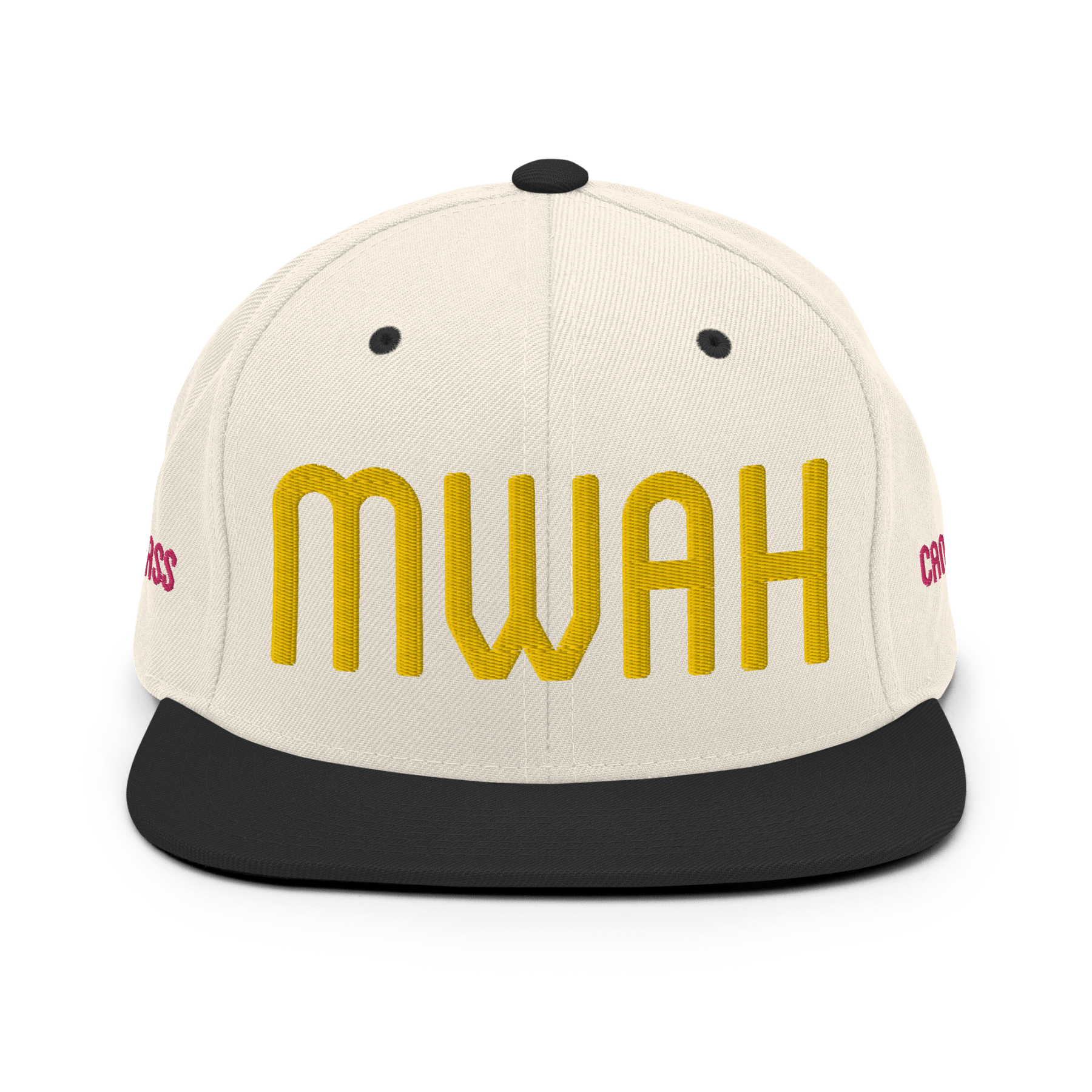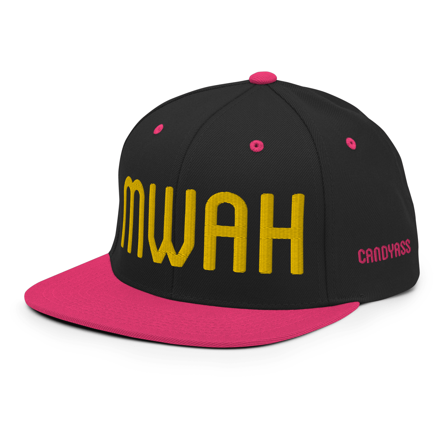 Throw a big chef’s kiss to everyone you meet with the MWAH hat from Candyass. Our full-deck, two-tone snapback hat is embroidered in four locations. The front features “MWAH” in raised lettering, and our ass-up heart icon is stitched on back above the closure, both in Candyass Gold. Our name is tagged on either side in Way Too Fuchsia. Makes a great gift.