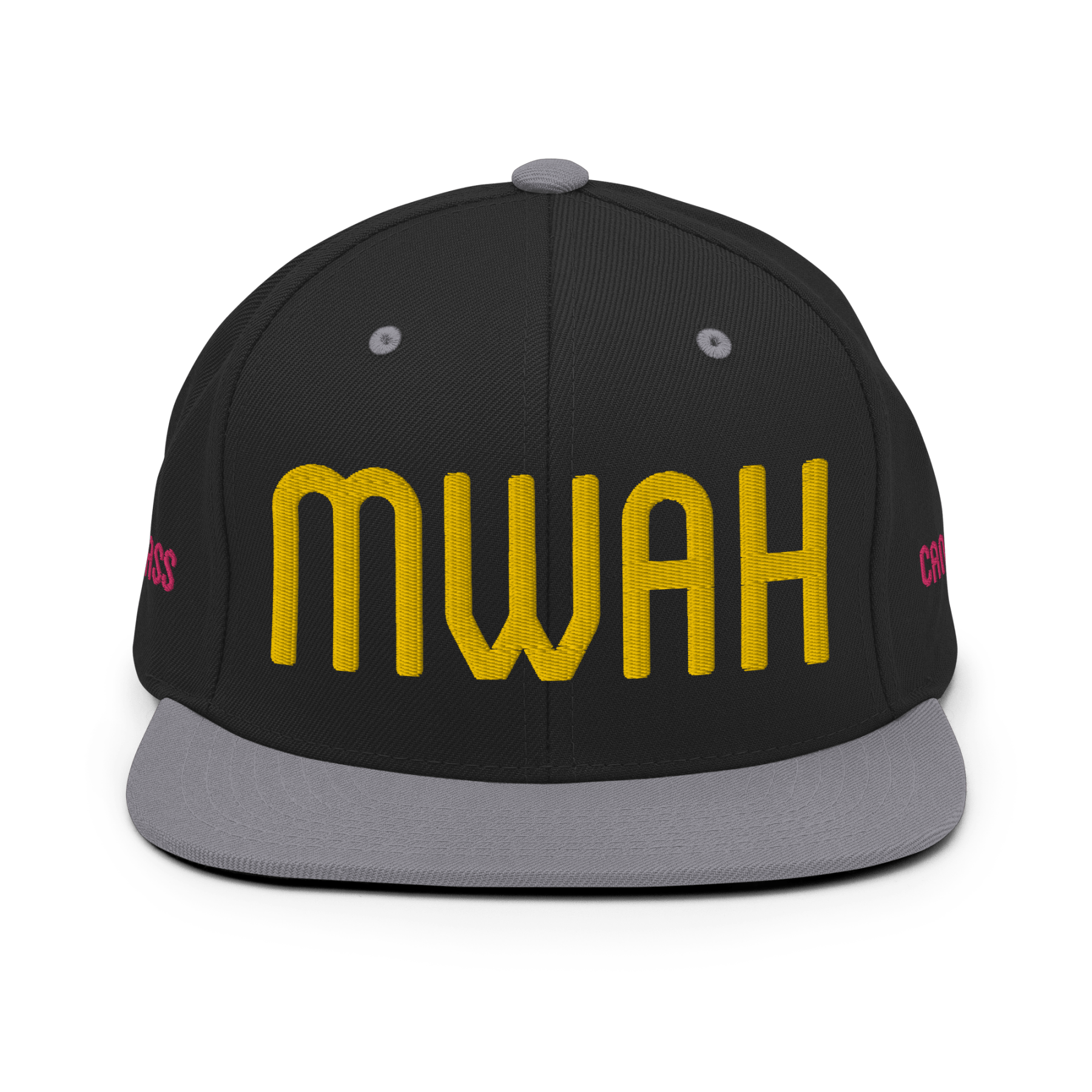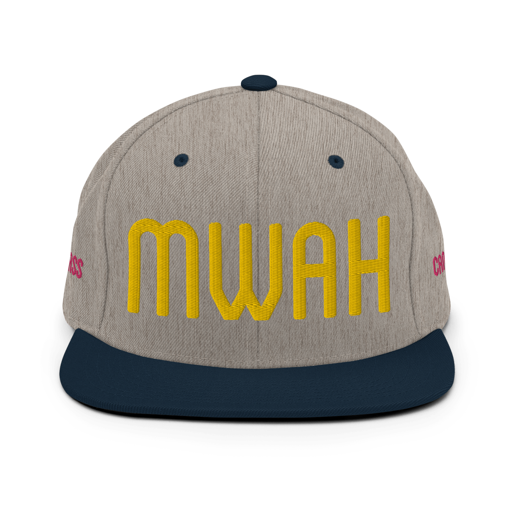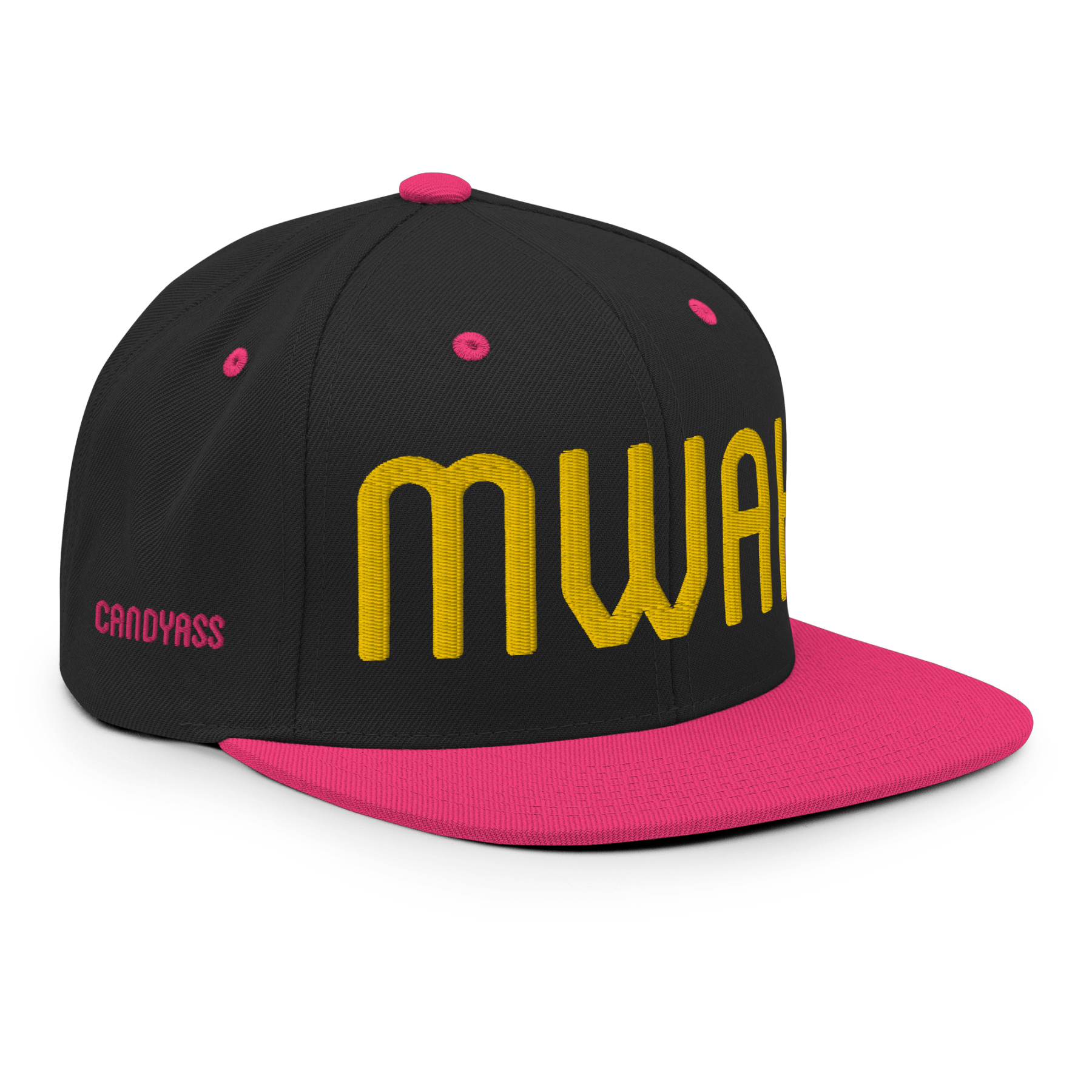 Throw a big chef’s kiss to everyone you meet with the MWAH hat from Candyass. Our full-deck, two-tone snapback hat is embroidered in four locations. The front features “MWAH” in raised lettering, and our ass-up heart icon is stitched on back above the closure, both in Candyass Gold. Our name is tagged on either side in Way Too Fuchsia. Makes a great gift.
